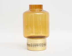 koppar, reliefdekor, fasetterad stam, originalkupa i glas med vit och orange dekor, ny el, höjd 42, diameter 27
