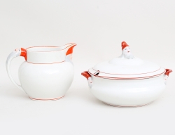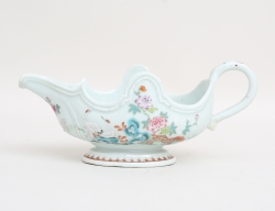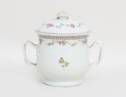 kompaniporslin sent 1700-tal/c.1800, polykrom dekor, delvis förgylld, monogram i rosettring, krönande fågelpar, höjd 13, bredd 8,5