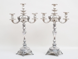 silver, CG Hallberg Norrköping 1911, tvådelade för vardera 5 ljus, dekor av knäckåsar och akantus, genombrutna tassfötter, fyllda bottnar, höjd 61