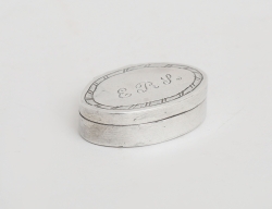 empir, troligen Johan H. Sjöman Vimmerby 1822, graverad dekor av blomma, kanten med spiralbård, lock med gångjärn för invändig förvaring, vikt 2,14 gram, 2,4x1,4
