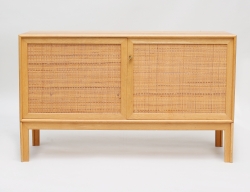 cocktailbar med 1 par barpallar, modell SK661 för J. Skaaning & Co 1960-tal, fronten med utfällbar skiva, inredning för flaskor och glas, nedtill utdragbar låda för flaskor samt mellanliggande låda, fotstöd i mässing, höjd 112, bredd 115, djup 40, citesintyg medföljer