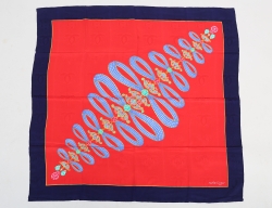 scarf siden, röd botten med dekor av juveler, blå bård, märkt Must De Cartier Paris made in France, originalfodral, 88x88