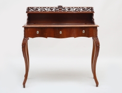 Stockholmsarbete 1700-talets andra hälft, fanerad med bla. jakaranda och plommon, beslag och ornament av mässing, 3 lådor, ursprunglig profilerad svängd skiva i röd kalksten, nätt modell, höjd 89, bredd 85, djup 44 (renoverad, kompletterad, äldre fanérlagningar)
