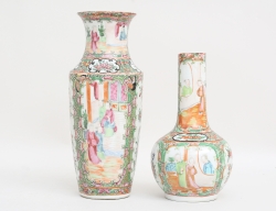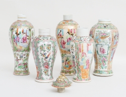 Qingdynastin 1800-tal, kanton, polykrom emaljdekor delvis förgylld, höjd 23-32 (locken med naggar, en vas med mynningsspricka, övriga vaser med konstlagningar) (5)