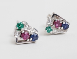 vardera med fasettslipad rubin, safir samt smaragd och 2 briljantslipade diamanter, Ana AB Helsingborg sent 1900-tal, för hål, vikt 4,77 gram, bredd 10mm.