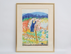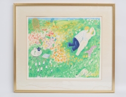färglitografi 116/310, "Paret i gräset", blyertssignerad, bladmått 48x65, rammått 57x64 (passepartout med gulnad, fuktfläckar nedre marginal)