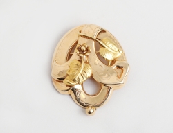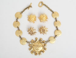 halscollier förgylld metall, rundlar med solansikte, originalask, längd 47, 2 par örhängen clips, bla.Edouard Rambaud Paris, förgylld metall, sjöstjärna respektive solkvinna (5)