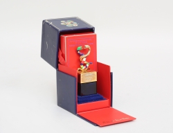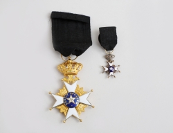 originaletui Carlman AB Stockholm, 18k respektive förgyllt silver och blå emalj, vitt kors med kronor mellan armarna, gyllene stjärna i mitten, svarta band (före 1974), vikt 18k utan band 13,75 gram, höjd 7 respektive 3