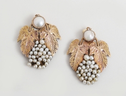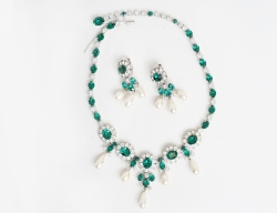 halscollier samt 1 par örhängen clips 1950-tal, silvertonad metall med slipade glasstenar i ofärgat och grönt, hängande saltvattenspärlor, märkta Christian Dior by Mitchel Maer, längd 41, örhängets höjd 4,5 (säkerhetskedjan defekt)