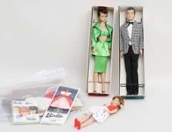 Barbie samt Ken i orignalkartonger, ställning, en mängd originalkläder, böcker, längd ca. 30 (kartonger med bruksslitage, Kens kartong med hål och lagad med tejp)