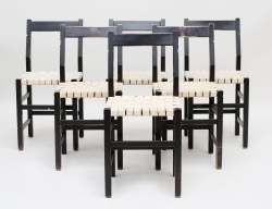 6 stolar "Schablon", svartlackerad stomme i bok, sits i flätad sadelgjord, höjd 80, sitthöjd 45, bredd 38 (färgslitage på samtliga samt fläckar)