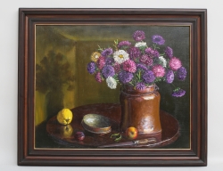 oljemålning på duk, astrar i kopparkruka, signerad 2000, 61x75, rammått 76x91, bok och vykort medföljer