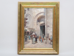 oljemålning på duk, gatubild med folkliv från Kairo, signerad, 85x60, rammått 110x85