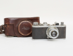1930/40-tal, Ernst Leitz DRP Wetzlar, serienr 348570, svart kamerahus, optik Leitz Elmar f=5 cm 1:3,5, brun kameraväska, bruksslitage, ej funktionstestad