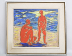 oljemålning på duk, röda figurer på strand, signerad, 46x55, rammått 64x72