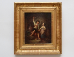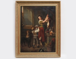 oljemålning på duk, uppfodrad, köksscen med hundar och hjälpreda, signerad, 91x70, rammått 107x85