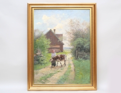 oljemålning på duk, sommaridyll med piga, signerad, 88x66, rammått 101x80 (smärre krackelyrer uppe vid himlen)