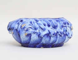 Marieberg 1765, fajans, dekor av fjäderskrud, signerad MBE under tre kronor 31/6-65, Ehrenreichs period (1758-1766), målarsignatur ES, höjd 7, bredd 15x10 (lock saknas, glasyravslag)