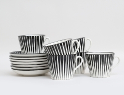 6 tekoppar med fat "Zebra", formgivna 1955, flintgods, höjd 8 (en kopp med smärre fotringsnagg, en kopp med smärre glasyrslitage)
