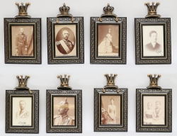 8 stycken varav 7 med egenhändiga autografer, sent 1800-tal, samtida ramar, Oscar II och Sofia krönta med kunglig rangkrona, Prins Oscar (1867), Eugen, Gustaf, Carl, Viktoria, 2 barn krönta med hertig rangkrona, 28x18 (8 tofsar saknas, kronor med smärre lagningar)