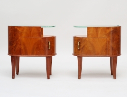1 par sängbord Swedish Modern 1900-talets mitt, pyramidmahogny, ovala fristående, en skåpdörr med handtag i mässing, kraftiga frostade glasskivor, märkta SMF (Svenska Möbel Fabrikerna), höjd 51, bredd 36x30