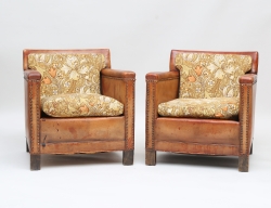 brun skinnklädsel, dekorspik i mässing, senare sits och ryggdyna klädda i textil "Golden Lilies", William Morris, höjd 69, bredd 67, djup 72 (nedsutten resårbotten, skinn med smärre skav, reva)