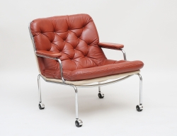 oidentifierad formgivare, stomme i kromad metall, löstagbar plymå i cognacsfärgat skinn, hjultrissor, sitthöjd 40, höjd 80, bredd 65 (smärre bruksslitage)