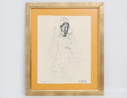 litografi 30/30, Jacqueline en Espagna ur mappen "La Flute double", vattenstämpel Au Vent D´ Arles, historik: inköpt av säljarens far på galleri i Paris på 1970-talet därefter i arv till nuvarande ägare, märkt Dimanche octubre -55 i vänster hörn samt stämpelsignerad Picasso, bladstorlek 53x42, rammått 72x62