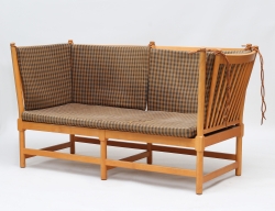 soffa "Tremme" modell 1789, Fritz Hansen, bok, lösa plymåer, etikettmärkt 0763, höjd 86, bredd 160, djup 72 (torr stoppning, framsida sarg med mindre avslag, tyg med skador/fläckar)