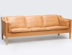 3-sits soffa modell 2213, Fredricia Stolefabrik, ljusbrunt skinn, lösa plymåer, etikettmärkt, höjd 75, längd 220, djup 80 (smärre bruksslitage)