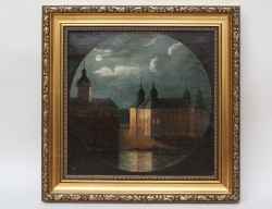 oljemålning på duk uppfodrad på pannå, Jakob de La Gardies palats Makalös (byggt 1630, nerbrunnet 1825) Kungsträdgåren Stockholm samt tornet av St Jakobs kyrka i månsken, 32x32, rammått 41x41( smärre färgbortfall, nålhål)