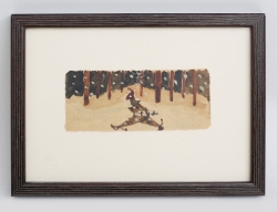 akvarellskiss, papper fäst på kartong, tomtenisse bland trädstammar och snöflingor, osignerad, 4x9,5, rammått 12,5x17 (pappret med nålhål och skada upptill i mitten)