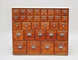 furu, 31 lådor, knoppar och handtag i kromad metall, senare stenskiva, proveniens: Allmäna BB Stockholm, historik: tidigare ägare arbetade på Allmäna BB och i samband med utrensning av inventarier införskaffades möbeln, höjd 85, bredd 103, djup 36 (bruksslitage, fanérskador vänster sida)