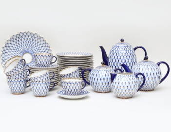 12 kaffekoppar med fat, 14 assietter, 2 kannor, sockerskål, gräddkanna samt skålfat, dekor i kobolt och förgylld, höjd 6