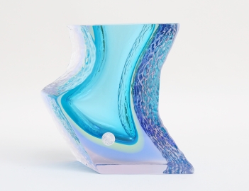 tjockväggigt glas i blå och turkosa toner, etikettmärkt, höjd 16,5