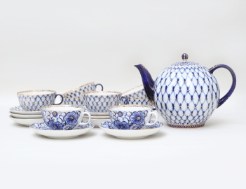 6+2 tekoppar med fat, tekanna, dekor i kobolt och förgylld, höjd 6/19 (9)