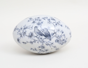 i form av ägg, porslin, blå dekor av fåglar och äppelblom, höjd 10, bredd 15x10 (spår av fäste/ställ)