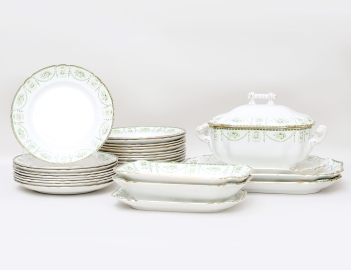 Gustavsberg tidigt 1900-tal, 9 mattallrikar, 10 djupa tallrikar, terrin med lock, uppläggningsfat, grön blomsterdekor med förgylld kant, längd 27-37, diameter 23,5 (delar med krackelyr)