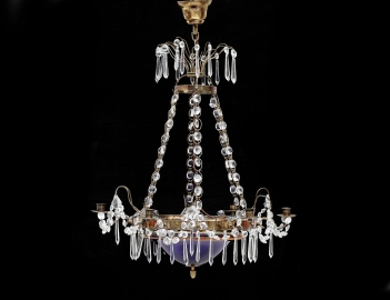stomme i patinerad mässing, fasettslipade olikformade prismor, blå glasskål med avslutande pinjekotte, för sex ljus, höjd 80, diameter 50