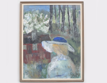 oljemålning på duk, kvinna i blå hatt, signerad, 83x65, rammått 90x72