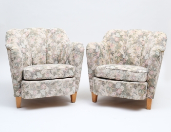 märkta Svenska Möbelfabrikerna, helstoppade, lös dyna i sitsen, blommig klädsel, ben i bok, höjd 70, bredd 77
