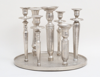 gjuten aluminium, sju olika ljusstakar på rund platta, höjd 27, diameter 35