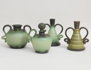 2 vaser samt kanna med propp "Grafit", höjd 13-15, vas "Oliv", höjd 15, glaserad keramik (4)