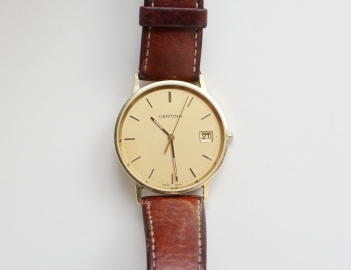 diameter 34mm., quartz, guldfärgad urtavla med stavindex och datum, ej funktionstestad (inskription, bruksslitage)