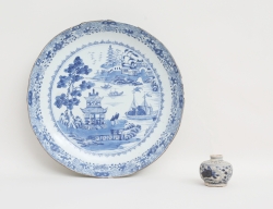 höjd 5,5, (krackelyrer, smärre mynningsnagg) skålfat Kina Qianlong 1736-1795, blåvit underglasyrdekor, diameter 28,5 (sprickor och kantglasyrbortfall) (2)