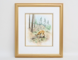 akvarell, rådjur betar skogsplantor, signerad, motivet är illustrerat i en skogstidning, 28x24, rammått 50x45