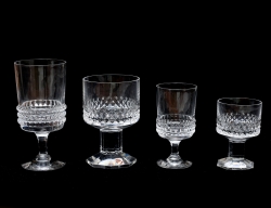 10 vinglas samt 8 starkvin "Gustav II Adolf", Nils Landberg Orrefors, höjd 8,5-11, (2 vinglas med obetydlig spricka/nagg), 5 vinglas samt 6 starkvin "Corona", Bengt Edenfalk Skruf, höjd 13,5