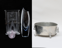 vas graverad dekor av kyrkoportal och rosettfönster, signerad, höjd 25 (smärre beläggning), vas signerad Strömberg B145, höjd 29, skål Murano Italien, höjd 8, skål art deco 1940-tal, tenn, höjd 11,5, diameter 23
