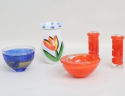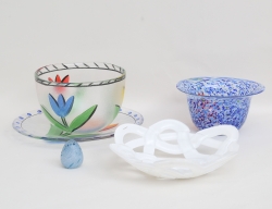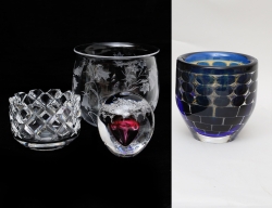 skål Ariel, signerad Ingeborg Lundin Orrefors nr. 361-77, höjd 14 (lagad), brevpress signerad Studio Åhus 1985, höjd 11, skål "Sofiero" Gunnar Cyrén, höjd 9, skål signerad Sigo Bauer Kosta höjd 15