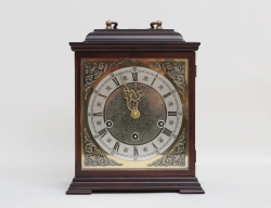 Junghans Tyskland, mörkbetsat trä, urtavla, handtag och urverk i mässing, höjd 26, bredd 20